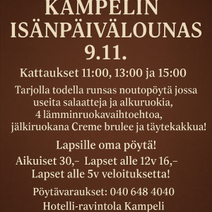Paketti sisältää ruokailun perinteisestä joulupöydästä, jossa tarjolla runsas jouluinen salaattipöytä, liha- ja kalaleikkeleitä, perinteistä joulukinkkua, laatikot, perunat, jouluinen rahkajälkiruoka sekä kahvi, tee
